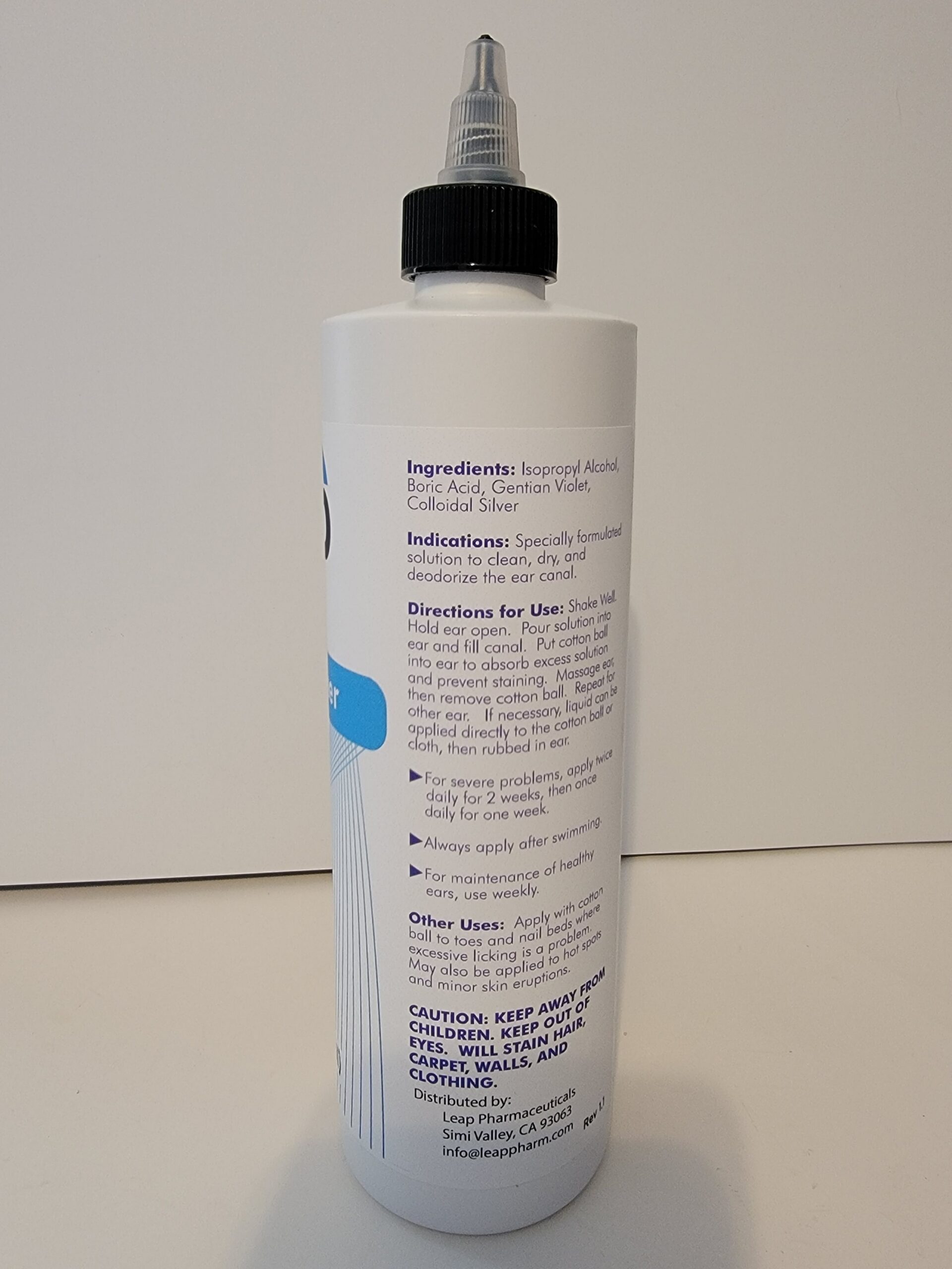 Pet Ear cleaning solution for regular maintenance and severe ear problems with Isopropyl Alcohol and Boric Acid , Gentian Violet and Colloidal Silver to help to fight an existing infection or for use to maintain a clean and dry ear of your furry friend. This is a safe and effective aid in maintaining good ear hygiene , helps deodorize and clean odors associated with ears.
