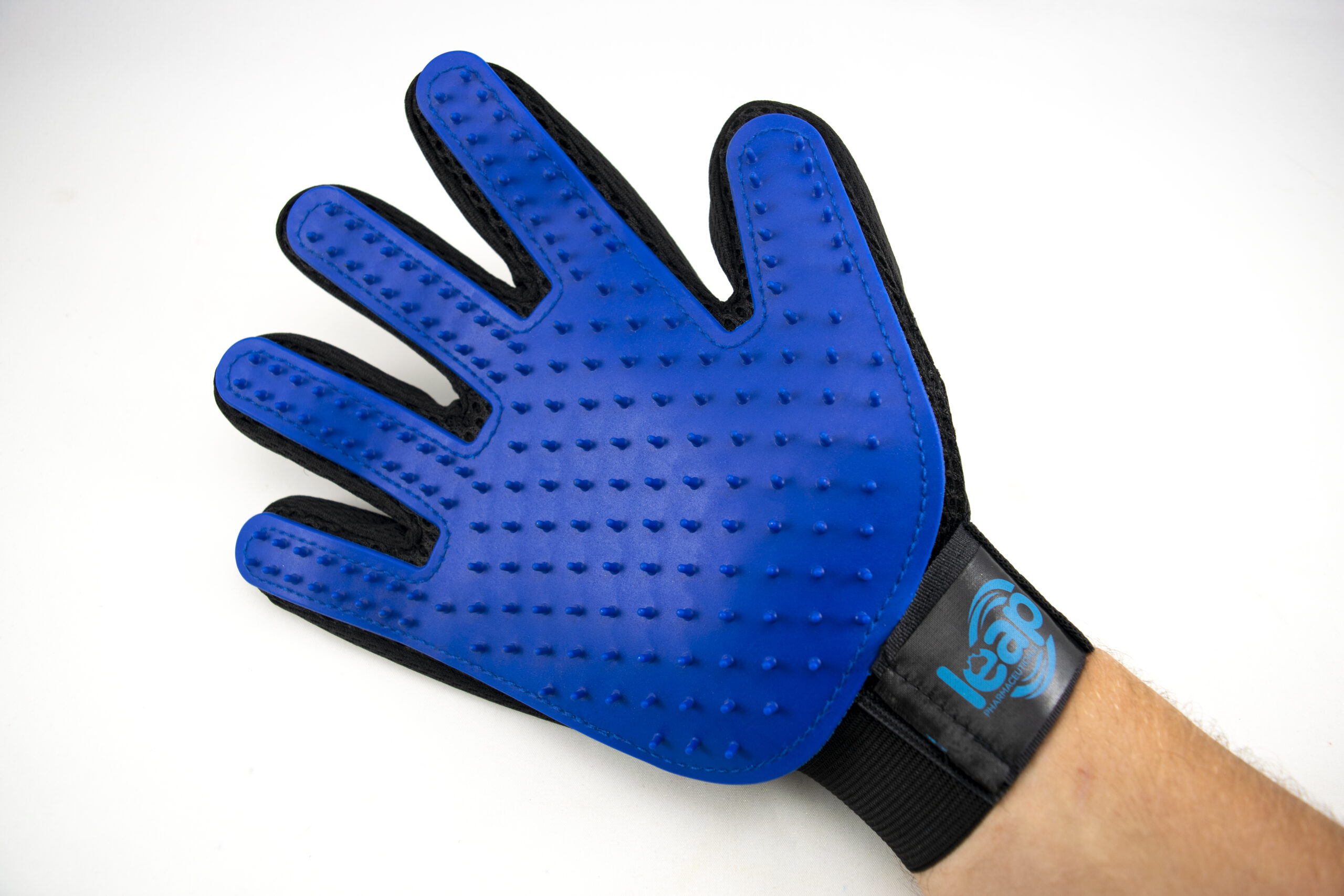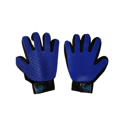 Leap Pharmaceuticals: Adjustable Size Pet Grooming Glove (Blue).You don’t have to pay professional groomer for deshedding, form a better connection with your pet and give them a healing massage with your own groomers glove. Each ultra-soft rubber grooming tip brushes away hair and makes sure skin isn’t irritated in even the most sensitive areas. Our unique design allows the hair removal gloves to gently take loose hair and dirt from your pets. Coarse, soft, curly, wiry, short, long, thick, and thin fur are no trouble for our gloves. Long and Short Hair Pets. This glove includes an adjustable strap at the wrist so one size truly fits all. The gloves use a mesh material to allow air to breathe in and keep your hands from sweating while using the gloves. LEAP gloves are perfect for any pet from the smallest to the largest, cats, dogs, and more. We make it easy and comfortable to give them the care they need. The Groomers Friend. Grooming is easy, just gently move the glove through your pet’s fur and just let the tips of the gloves do the work for you. Casually approach your pet so they don’t become concerned about the grooming session. Then just slowly work through their fur to remove loose hair and dirt while giving a comforting massage. With regular sessions these massages can become a favorite part of your pet’s week. Take the Leap: We make grooming your pet at home easy for you and your pet. We create pet care tools that help keep your furry friends healthy and happy. If you have questions or need help for any reason, just let us know.